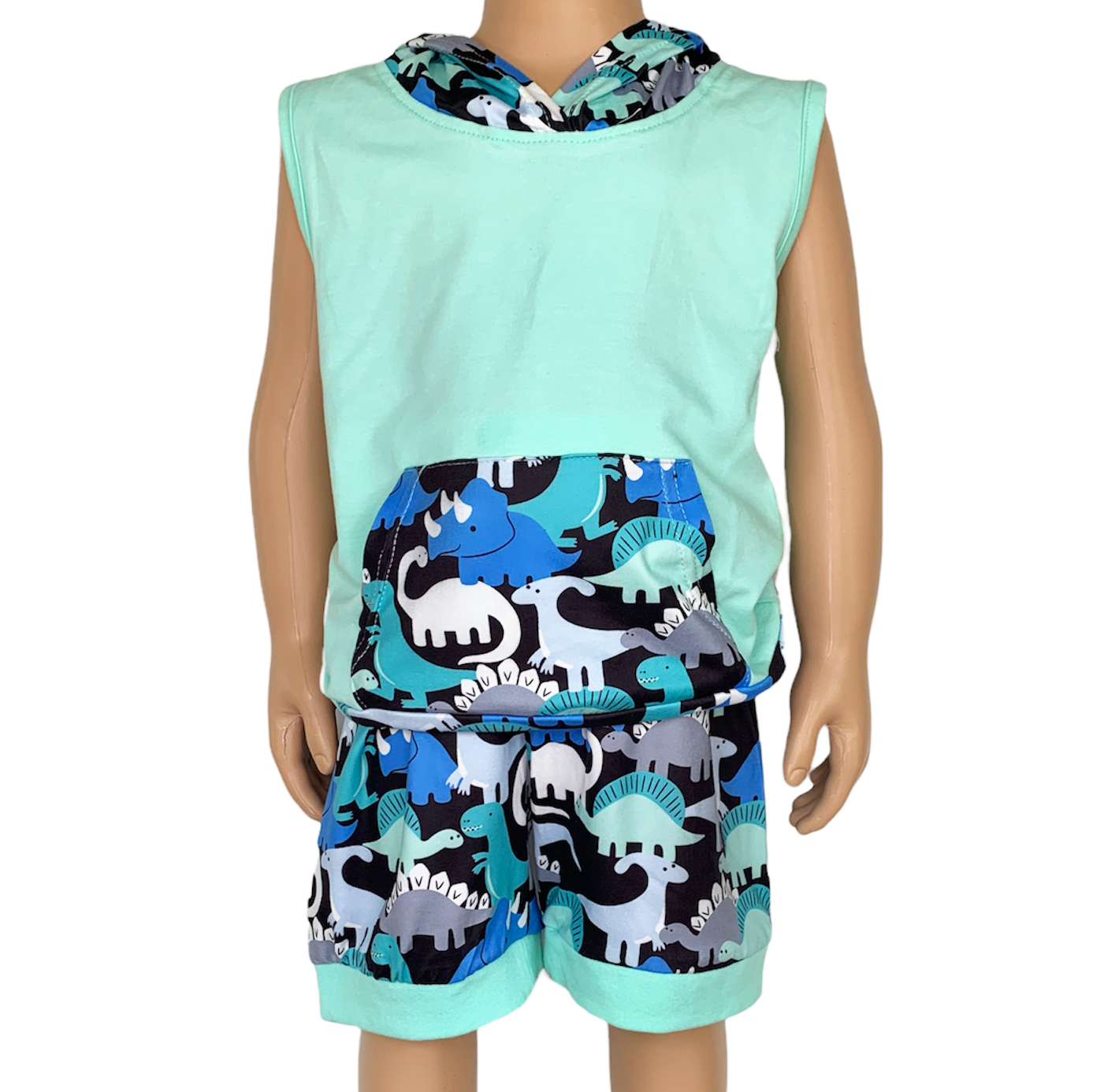 AL Limited Boys Dinosaur Shorts Set. Hoodie Blue Tank Top with Dinosaur Kangaroo Pocket and Hoodie.