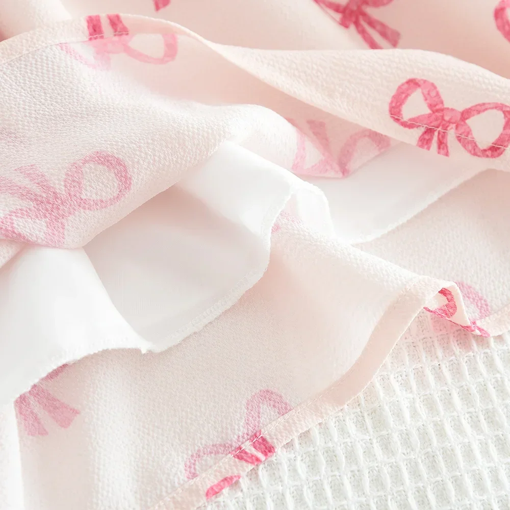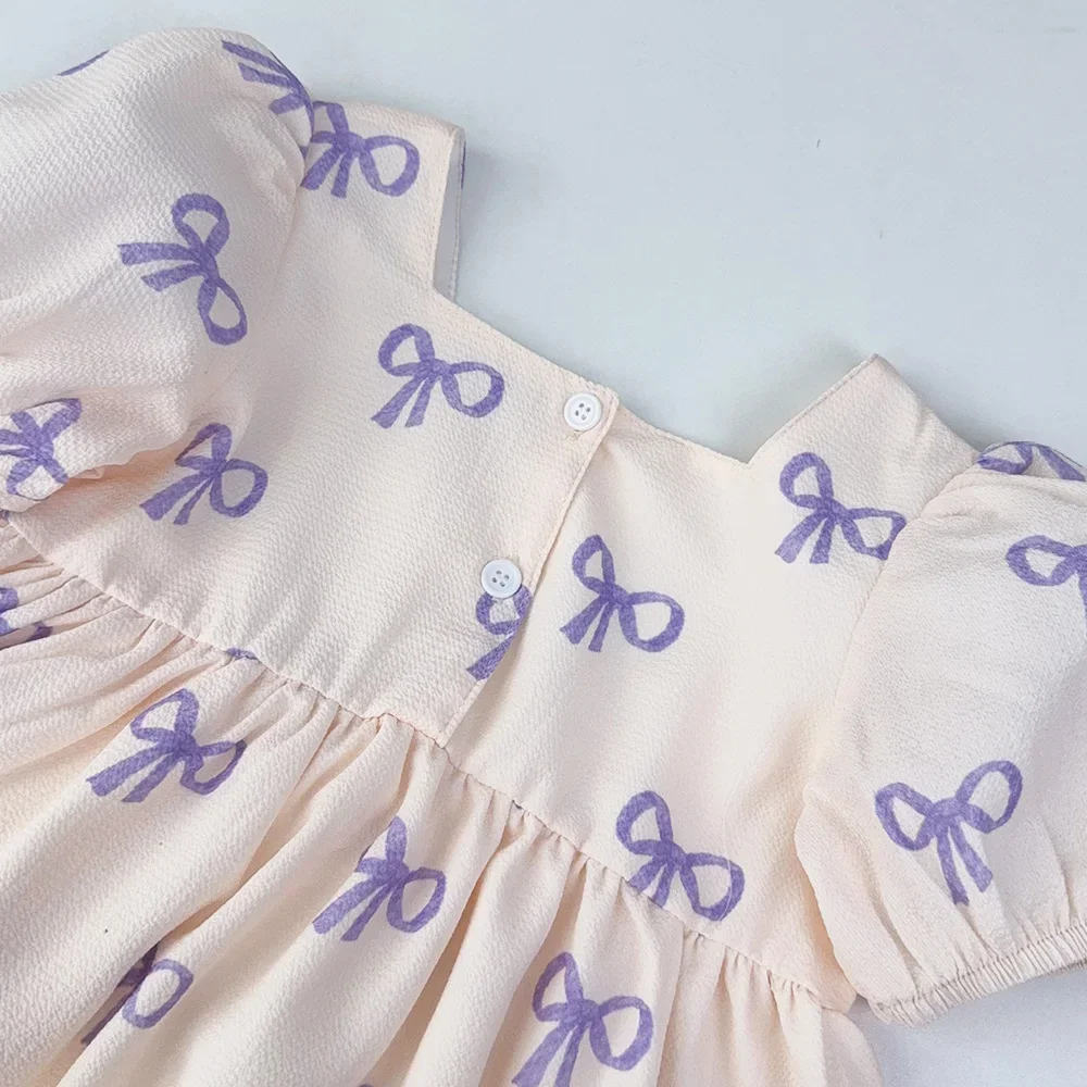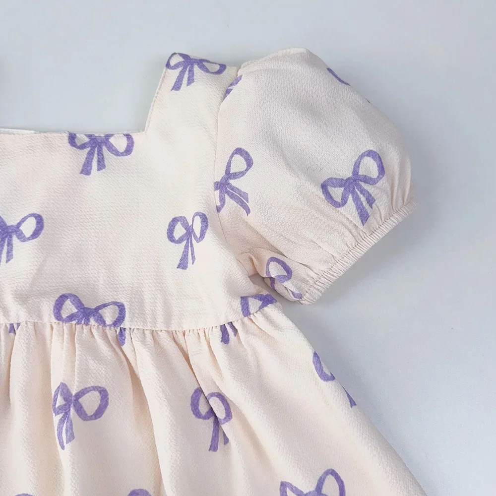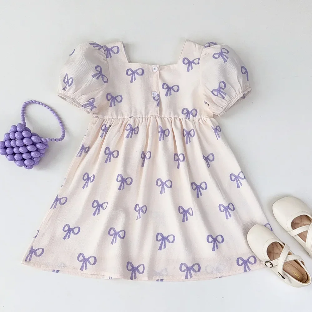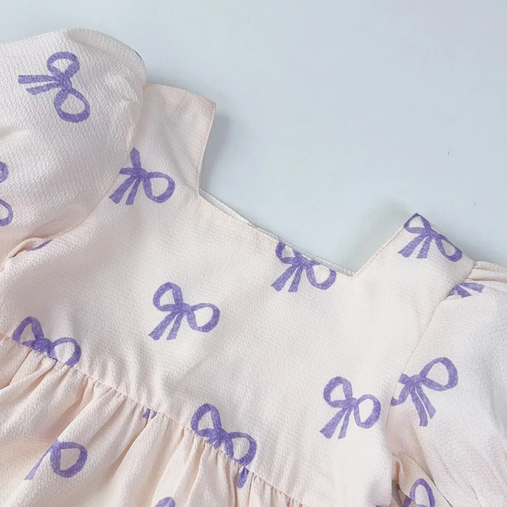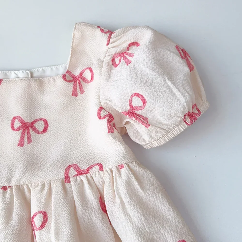 Bear Leader Summer Short Sleeved Girls Casual Dresses Pink Bow Print Square Neck Sweet Princess Dress Daily Simple Kids Clothes